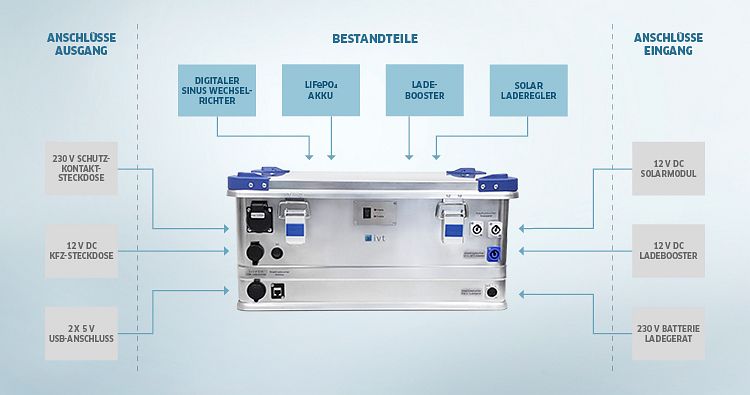 Hinweis: Auf Anfrage können einzelne Bestandteile der bestehenden Box ausgetauscht werden (Wechselrichter, Akku) oder entfallen (Ladebooster, Solar-Controller).