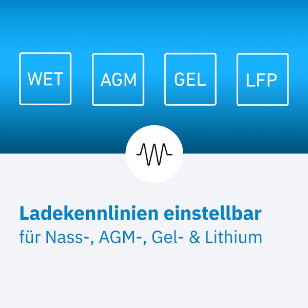 - Wählbare Ladekennlinien für Nass-, AGM-, Gel- und Lithium-Batterien