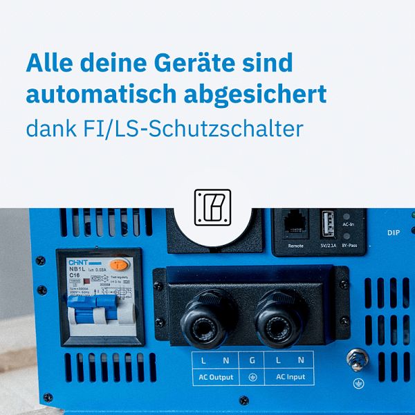 Der TSI PRO ist kein einfacher Inverter – er ist ein durchdachtes Sicherheitssystem für deine mobile Stromversorgung. Besonders praktisch: Durch den integrierten FI/LS-Schutzschalter sparst du dir aufwendige Zusatzinstallationen. Alles, was du brauchst, ist bereits enthalten. Anschließen, einschalten, fertig.