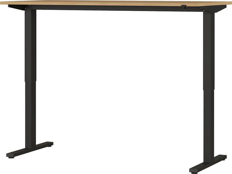 Elektrisch höhenverstellbarer Schreibtisch mit zwei T-Füßen; Tischplatte (belastbar bis zu 80 kg) in der Farbe Grandson-Eiche-Nachbildung, Gestell aus pulverbeschichtetem Metall in Schwarz; mit Stromkabel, Stecker und Bedieneinheit zum stufenlosen hoch- und herunterfahren der Tischplatte (von 72-120 cm); Melaminharzbeschichtung, ABS-Kanten; Made in Germany.
