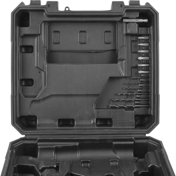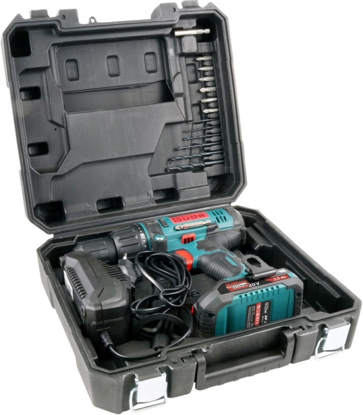 - Schlagbohrschrauber, Akkupack 2Ah, Schnellladegerät 2,4A, Koffer mit Metallschnallen und 14 tlg. Bohrer & Bit Zubehör: