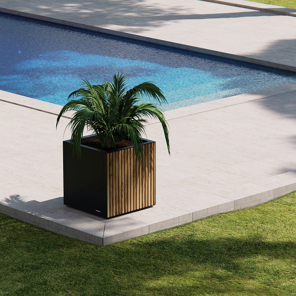 Der quadratische Pflanzkasten ist aus feuerverzinktem und pulverbeschichtetem Stahl gefertigt, was ihn beständig gegen Witterung macht. Die vertikal angeordneten Holzleisten verleihen dem metallischen Kubus eine moderne und natürliche Ästhetik, die perfekt zur zeitgenössischen Architektur passt.