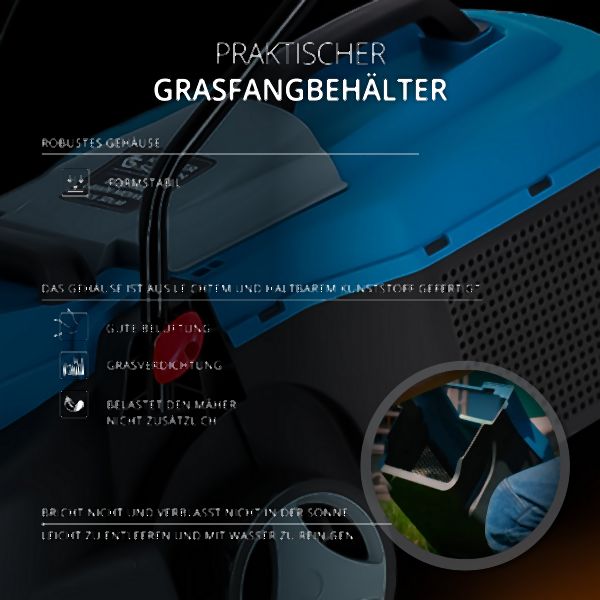 Könner & Söhnen® Elektro-Rasenmäher sind einfach aufgebaut, sodass die Vorbereitung für die Arbeit, die Wartung oder die Lagerung schnell, einfach und werkzeuglos erfolgen kann. Dies erleichtert dem Benutzer den Umgang mit dem Gerät und spart Zeit und Mühe.