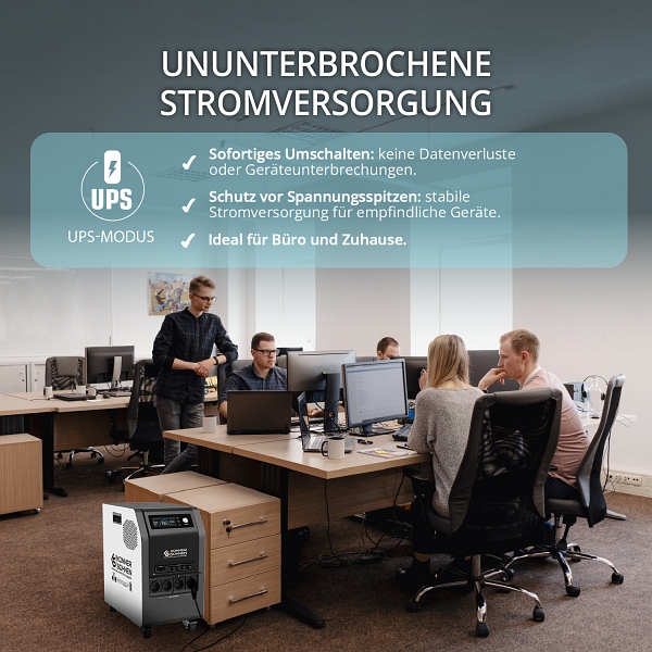 Die Powerstation gewährleistet eine kontinuierliche Stromversorgung angeschlossener Geräte, selbst bei Stromausfällen oder Spannungsschwankungen im Netz. Innerhalb von Millisekunden stellt die Station die Spannung für die Geräte bereit und schützt so vor Datenverlust, Beschädigung von Geräten und Unterbrechung von Arbeitsprozessen.
