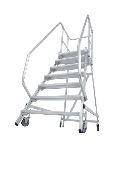 - Fahrbare, einseitig begehbare Aluminium-Podestleiter mit tiefen Stufen, beidseitigem Geländer, großer Standplattform für sicheres und bequemes Arbeiten.