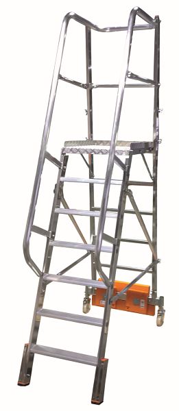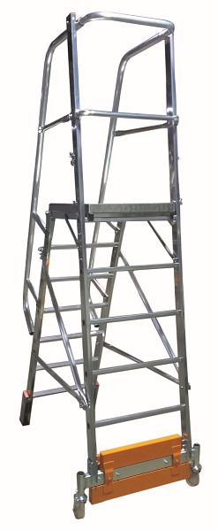 - Einseitig begehbare Aluminium-Podestleiter mit geringer Grundfläche, Auswahlmöglichkeit zwischen Traverse und Ballastierung für die Anwendung in schmalen Regalgängen.