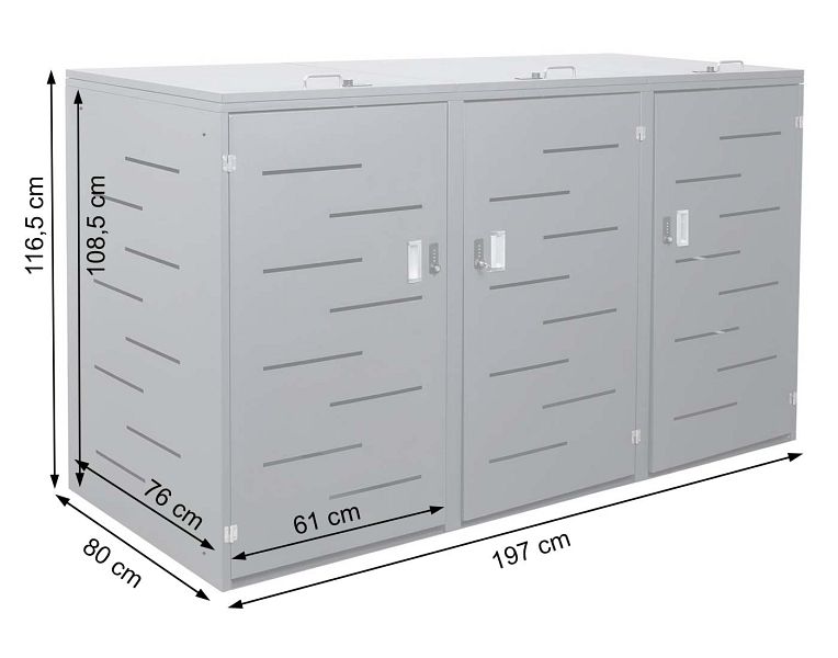 Die Modelle unserer Serie HWC-E83 sind erweiterbar, ganz egal wie viele Mülltonnen Sie unterbringen möchten - Ihnen sind hier keine Grenzen gesetzt. Bitte achten Sie bei der Kombination lediglich auf die passende Gesamttiefe der jeweiligen Modelle. Nur Modelle mit gleicher Tiefe können über seitlich vorhandene Bohrlöcher durch Schrauben aneinander befestigt werden. Zwischen den einzelnen Abteilen einer 3er-Mülltonnenverkleidung gibt es keine Trennwand. Jedes Abteil ist für handelsübliche Mülltonnen mit einem Fassungsvermögen von 80 bis 240 Litern ausgelegt. Der Deckel ist mit einer Gasdruckfeder ausgestattet. Diese erleichtert das Öffnen und Schließen und damit das Befüllen der Mülltonnen mit nur einer Hand. Deckel und Tür sind getrennt abschließbar: sie verfügen jeweils über ein normales Schloss und ein Zahlenschloss, das individuell mit einem 4-stelligen Sicherheitscode eingestellt werden kann. Im Lieferumfang ist ein Schlüssel für alle Schlösser enthalten. Bitte achten Sie darauf, die Mülltonnenverkleidung mit denen im Lieferumfang enthaltenen Dübeln und Schrauben im Boden zu verankern, um deren Stabilität sicherzustellen.