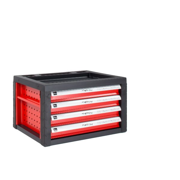 Diese Werkzeugkiste besteht aus gut verarbeitetem, pulverbeschichtetem Metall. Alle 4 kugelgelagerten Schubladen sind mit Antirutschmatten ausgelegt und mit Vollauszug bedienbar. Die Griffe der Schubladen haben eine eigene Mechanik zum Öffnen der Schubladen. So gehört versehentliches Öffnen beim Rangieren oder Transportieren der Vergangenheit an. Ebenso hat dieser Aufsatz Griffe sowie eine große Ablagefläche.