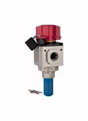 3/2-Wege-Absperrventil G mit Haltewinkel, Vorhängeschloss u. Schalldämpfer, handbetätigt, BG 400, G 3/8, Eingangsdruck 0 - 9 bar. Mit Knebelgriff, 90 drehbar, abschließbar / Das Ventil dient zum Abschalten der Luftversorgung und wird in der Regel Druckreglern, Filterreglern oder Wartungseinheiten vorgebaut. Beim Schließen des Ventils entweicht die restliche angestaute Luft auf der P2-Seite über die unten angebrachte Entlüftungsbohrung in die Atmosphäre.
