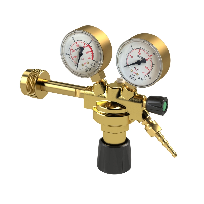 Flaschendruckminderer, Flaschendruck 300 bar, für nicht brennbare Gase, Gasart: Sauerstoff, Arbeitsdruck 0 - 10,0 bar. Einstufige Bauart in Pressmessing-Ausführung nach DIN EN ISO 2503, mit Absperrventil und Sicherheitsventil sowie je einem Manometer für Flascheninhalt und Arbeitsdruck. Flaschendruckminderer dienen zur Reduktion eines in einer Flasche mit einem bestimmten Fülldruck/Vordruck verdichteten, verflüssigten und gelösten Gases auf einen sehr viel niedrigeren, möglichst konstanten Hinterdruck/Überdruck und zwar dies möglichst unabhängig von Schwankungen des Vordruckes und des Durchflusses. Flaschendruckminderer mit Anschluss an Gasflaschen sind geeignet für die Druckreduktion verschiedener Gase. Sie haben eine Bauartzulassung nach DIN EN ISO 2503 für die Anwendungsbereiche Schweißen, Schneiden und verwandte Verfahren. Die Anschlüsse sind nach DIN 477 ausgeführt.