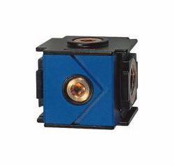 Verteiler variobloc, BG 2, G 1/2, mit 4 Abgängen: oben / unten G 3/8 / G 1/2 und vorne / hinten G 1/4. Zur Entnahme ungeölter Luft wenn der Verteiler vor dem Nebelöler angeflanscht wird. Ein integriertes Rückschlagventil verhindert das Einfließen von Öl aus dem Nebelöler oder der Leitung.