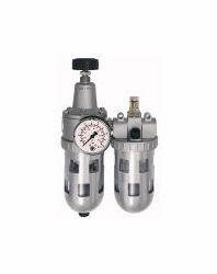 Wartungseinheit 2-tlg. Standard, PC-Behälter und Schutzkorb, BG 2, G 3/8, Eingangsdruck max. 16 bar, Regelbereich 0,5 - 10 bar. Zweiteilige Wartungseinheiten, bestehend aus einem vordruckunabhängigen, rücksteuerbaren Membrandruckregler mit Sekundärentlüftung in Verbindung mit einem Zentrifugalabscheider und einem Proportionalöler.