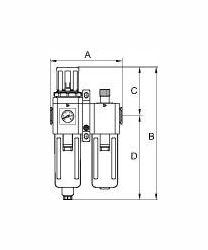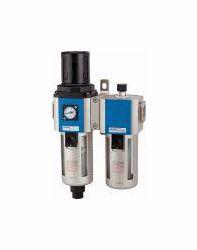 Wartungseinheit 2-tlg. G mit PC-Behälter u. Schutzkorb, 5 m, BG 400, G 3/8, PE max. 10 bar, Regelbereich 1,5 - 9 bar, Ablass HA. Zweiteilige Wartungseinheiten, bestehend aus einem vordruckunabhängigen Membrandruckregler mit Sekundärentlüftung in Verbindung mit einem Zentrifugalabscheider und einem Proportionalöler.