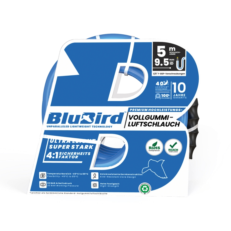 Vollgummi-Werkstattschlauch-Set »BluBird«, Schnellverschlusskupplung NW 7,2, Schl.-Ø 15,5x9,5, Temp. -20 bis 85 °C, Länge 5 m. Hochflexibler silikonfreier Schlauch für Druckluftanwendungen im Werkstattbereich (Druckluftzufuhr für pneumatische Werkzeuge, Ausrüstung von Montagestationen etc.) konfektioniert mit Schnellverschlusskupplung NW 7,4. Nicht geeignet für die direkte Montage an pulsierendem Werkzeug. Wir empfehlen die Verwendung unserer Vibrationsdämpfer, gemäß ISO 6150, § 7.1.